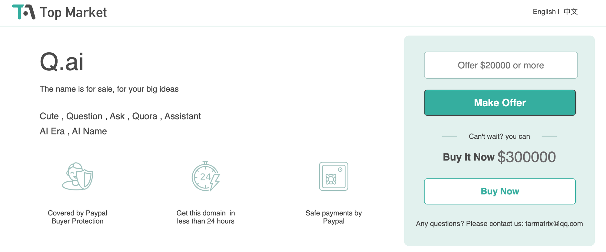 The exact purchase price of the Q.ai domain was never publicly disclosed. However, using the Wayback Machine, I found that Q.ai was listed for sale at abot.ai (a domain marketplace) with a $300k BIN in late December 2021, but there are no public confirmations on the purchase price.
