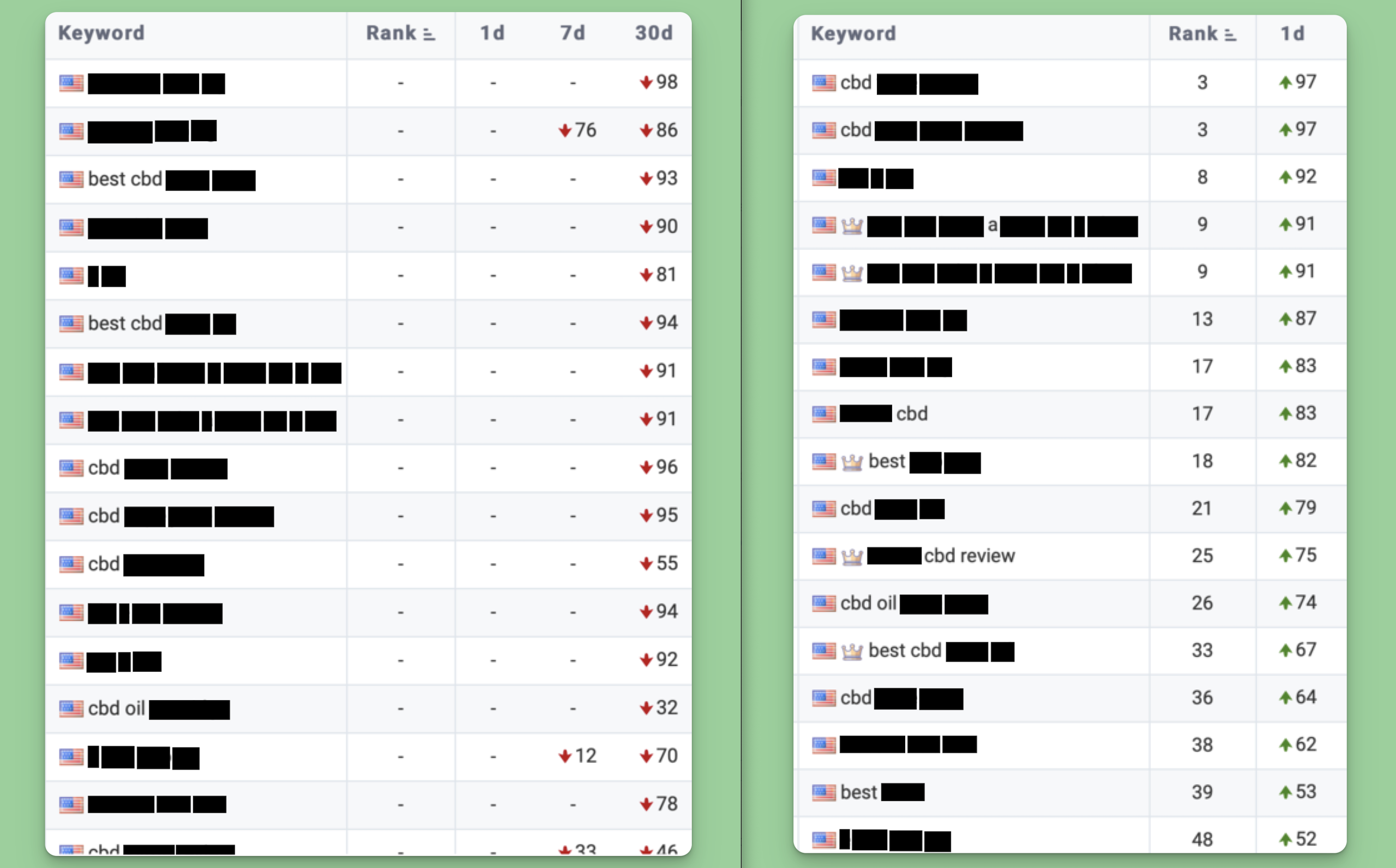 (those little crowns represented that keyword having the featured snippet, which is a little SERP feature that used to be around back when we could still have nice things before AI overviews. Immediately these KWs popped back in the featured snippet/#1 spot).